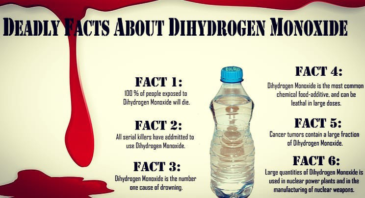 In 1997, Nathan Zohner, a high school student, as a part of his science project, “How gullible are we,” successfully got fellow students to sign his petition to ban DHMO (Dihydrogen Monoxide), which is basically two molecules of hydrogen and one of oxygen- H2O / Water!